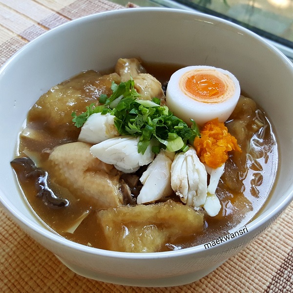 3. ตั้งหม้อใส่น้ำ กระเทียม รากผักชี เม็ดพริกไทย ปีกไก่บน เกลือ และน้ำตาลกรวด ต้มให้เดือดสักพักใหญ่ ใส่ซีอิ๊วขาว น้ำมันหอย และซีอิ๊วดำเล็กน้อย คนให้เข้ากัน เมื่อไก่เริ่มนุ่มแล้วใส่กระเพาะปลา เห็ดหอม และหน่อไม้ ชิมรสตามชอบ ระหว่างรอเดือดอีกครั้ง ละลายแป้งข้าวโพดกับน้ำให้เข้ากัน แล้วเทลงไปในขณะที่กำลังเดือด รีบคนให้เข้ากันจนข้นได้ที่แล้วปิดไฟ