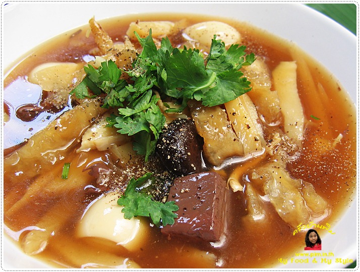 4. ตักใส่ชาม แต่งหน้าด้วยกรรเชียงปู ไข่ต้มยางมะตูม โรยหน้าด้วยต้นหอม ผักชี และพริกไทย เสิร์ฟพร้อมกับจิ๊กโฉ่วหรือพริกน้ำส้ม กินกับเส้นหมี่ก็อร่อย