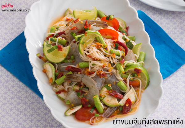 3. ใส่กุ้งดองน้ำปลา มะเขือเทศราชินี มะเขือเปราะ มะนาวฝาน และเส้นขนมจีน คลุกเคล้าพอเข้ากัน ตักใส่ภาชนะ โรยผักชีฝรั่ง จัดเสิร์ฟ
